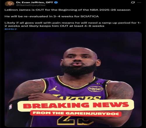 一位NBA高管匿名接受Lakers Daily記者Ashish Mathur采訪時表示:“坐骨神經痛真的非常痛苦,詹姆斯的身體恢復速度已經大不如前,如果他在10月或11月不打比賽,我對此不會感到驚訝。湖人必須謹慎對待詹姆斯的這次傷病,我認為他們會非常謹慎小心。”